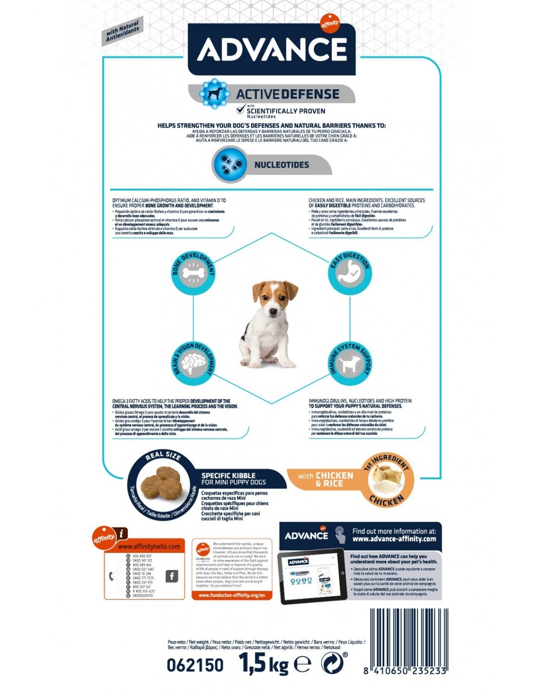 Advance Puppy Mini Perros es un alimento de alta gama formulado para cubrir sus necesidades nutricionales específicas favoreciendo el máximo desarrollo de su sistema digestivo e inmunitario, reforzando sus defensas y garantizando el correcto desarrollo de sus huesos, con un alimento fácil de digerir.