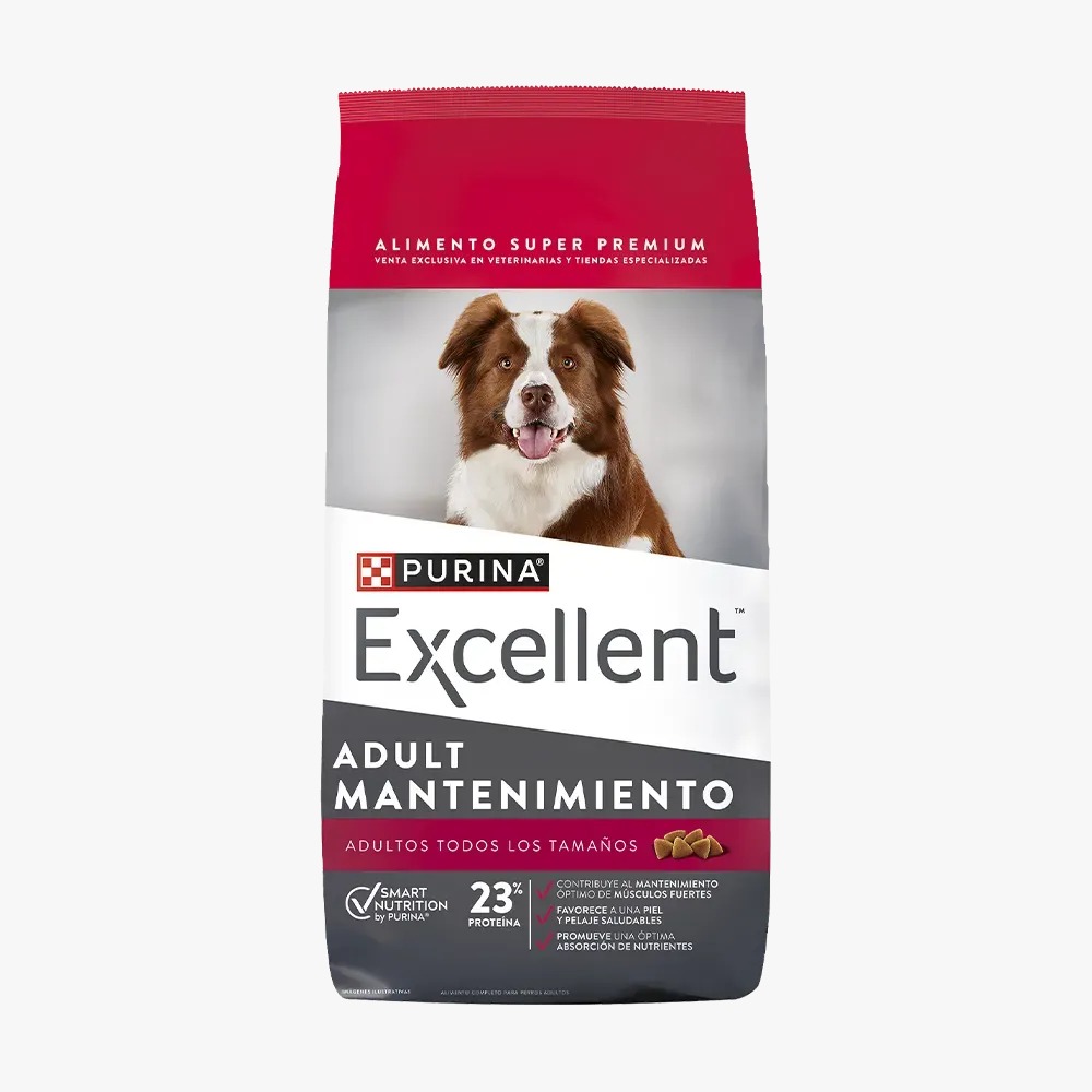 Excellent Mantenimiento Perros Adultos contiene harina proteica de pollo, maíz y/o trigo y/o arroz, harina de soya y/o gluten de maíz, harina de carne y hueso vacuna y/o porcina, grasa (vacuna y/o porcina y/o avícola y/o vegetal y/o pescado) como fuente de ácidos grasos omega 6, hidrolizado a base de menudencias y/o vísceras de pollo y/o cerdo, sales minerales, harina de pescado y/o harina de alga (Schizochytrium sp.), vitaminas (A, B1, B2, B3, B5, B6, B7, B9, B12, D3, E, K3), minerales [(sulfatos: manganeso, hierro, cobre, zinc), (proteinatos y/o glicinatos: manganeso, hierro, cobre, zinc, selenio), yodato de calcio o potasio, selenito de sodio], cloruro de colina, L-lisina y DL-metionina.