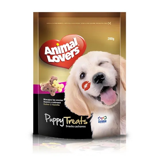 Animal Lovers Puppy Treats son deliciosos snacks para perros cachorros con sabor a vainilla que tu perro disfrutará. Son un suplemento alimenticio ideal para suministrar como premio o simplemente para consentirlos y demostrarles tu amor. Gracias a su textura especial, estas galletas para perro se encargarán de masajear sus encías.