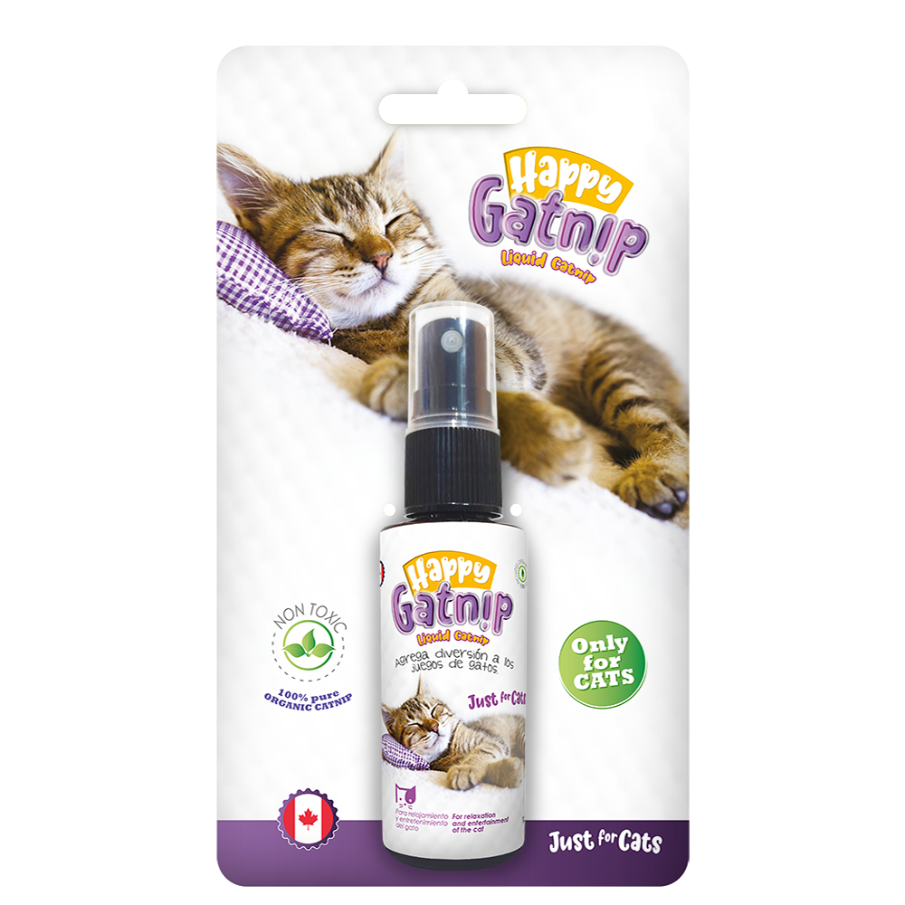 Happy Gatnip Spray 46 ml. Catnip líquido concentrado para estimular el juego, reducir ansiedad y enseñar a rascar. 100% natural, seguro y de origen canadiense.