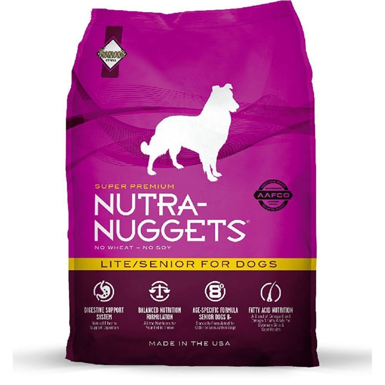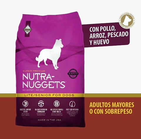 DECLARACIÓN DE AAFCO: La fórmula para perros Nutra Nuggets Lite / Senior está formulada para cumplir con los niveles nutricionales establecidos por los perfiles de nutrientes de alimentos para perros de la AAFCO para su mantenimiento.