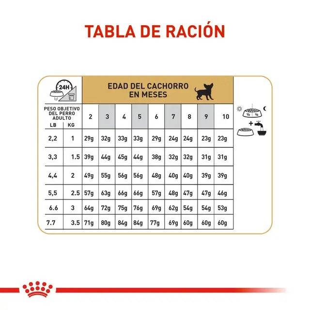 - Alta Palatabilidad: El Chihuahua suele tener un apetito caprichoso. Por ello se recomienda una alimentación de gran palatabilidad. Royal Canin Chihuahua Cachorro satisface el apetito delicado del cachorro Chihuahua gracias a una combinación de tres factores: una selección cuidadosa de sabores y aromas excepcionales y una croqueta con forma y tamaño personalizados.