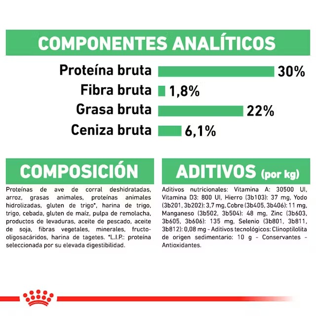 - Proteínas de alta digestibilidad (L.I.P.): Una fórmula nutricional equilibrada con precisión que ayuda a mantener una salud digestiva óptima. Contiene proteínas altamente digestibles (L.I.P.), una mezcla de prebióticos y fibras para favorecer una flora intestinal equilibrada y ayudar a promover una calidad óptima de las heces.