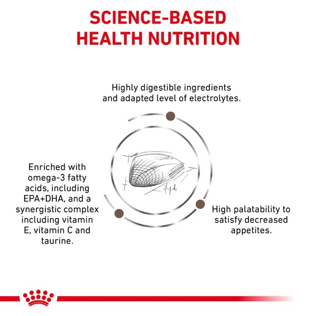 - Características de la Fórmula: Las especificidades de esta fórmula son: A. Ingredientes altamente digeribles y nivel adaptado de electrolitos. B. Enriquecido con ácidos grasos omega-3, incluidos EPA+DHA, y un complejo sinérgico que incluye vitamina E, vitamina C y taurina. C. Alta Palatabilidad para satisfacer apetitos disminuidos.