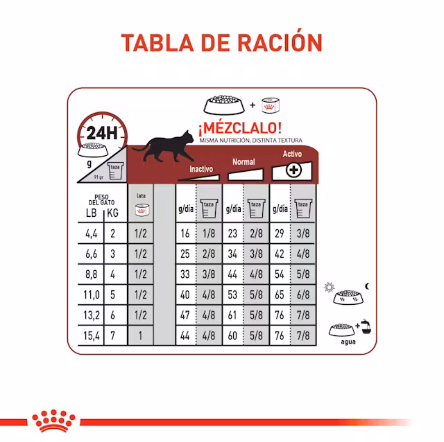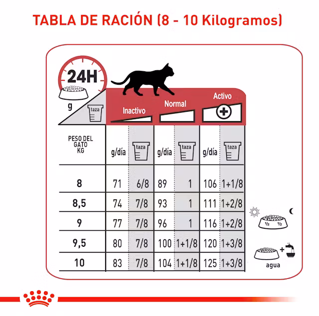 | Peso del gato | Nivel bajo de actividad | Normal | Nivel alto en actividad | |||