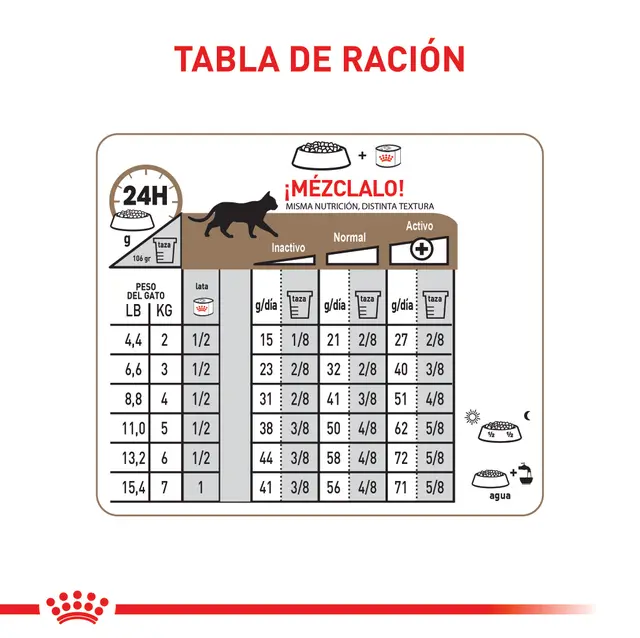 | Sobrepeso (croquetas + 1 bolsita) | 15 g + 1 bolsita | 22 g + 1 bolsita | 29 g + 1 bolsita | 36 g + 1 bolsita |