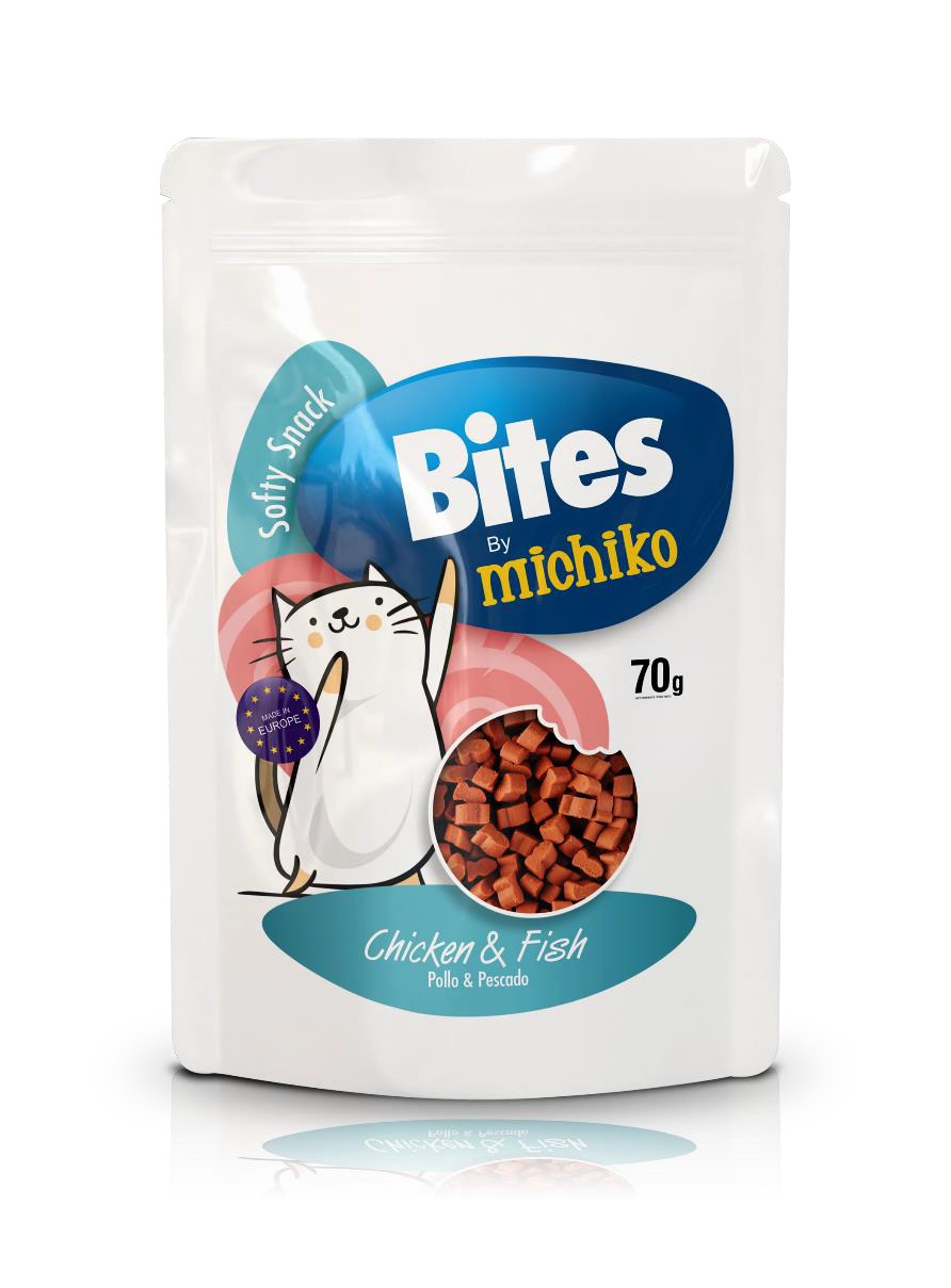 Snack suave para gatos Michiko Bites sabor pollo y pescado. Ideal como premio diario para gatos de todas las razas y edades.